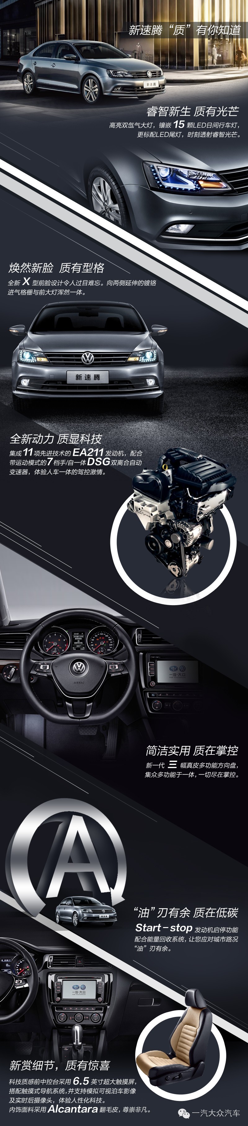 作为一款德国血统的大众经典车型,速腾品牌自诞生之始就专注于最新德国工艺与现代动感造型的完美结合,以原汁原味的德系血统、精湛的制造工艺、领先的科技装备,让国内消费者在平实、中庸的传统A级轿车之外,拥有了一个品质卓越、科技领先、性能出众的新选择,开创了真正的A+级细分市场,也缔造了A+级别的行业标准。自2006年第一代车型上市以来,已累计销售了130万辆,书写了A+级市场的纪录。今天,将最新德国工艺与现代动感造型完美结合的大空间A+级舒适轿车——一汽-大众新速腾,在造型设计、动力操控、舒适安全等方面,将A+级轿车的品质标准提升到一个全新高度,为充满自信和激情、注重品质和品位、追求个性与创新的城市精英带来无与伦比的驾乘体验。一汽-大众汽车有限公司董事、总经理张丕杰先生表示:“新速腾不仅传承了德国大众汽车的精髓,更为满足中国消费者的需求而进行了创新和升华。新速腾所映射出的德国精致工艺、大众“质”造标准以及质感人生体验,为整个中国A+级汽车市场树立了难以逾越的新标准。”