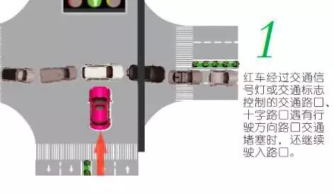 红车经过交通信号灯或交通标志控制的交通路口、十字路口遇有行驶方向路口交通堵塞时,还继续驶入路口。属于“闯绿灯”依《道路交通安全法实施条例》中第五十三条规定,可处200元罚款扣2分。