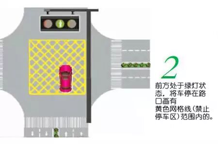 前方处于绿灯状态,将车停在路口画有黄色网格线(禁止停车区)范围内的,此种情况属于“闯绿灯”。