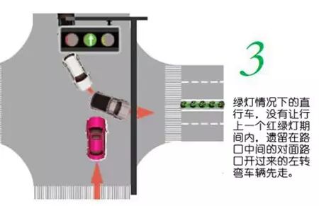 绿灯情况下的直行车辆,没有让行上一个红绿灯期间内,遗留在路口中间的对面路口开过来的左转弯车辆先走。