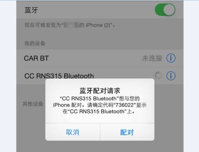找到CC的蓝牙设备名称,如上图“CC RNS315 Bluetooth”,点击连接。