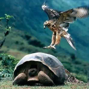 10. 一只乌龟在沙滩上晒太阳,这时飞来一只老鹰,乌龟觉得自己有坚硬的壳,老鹰拿它没办法就有恃无恐。结果老鹰一爪子抓起了乌龟,飞到上千米的高空,在飞过一片岩石的时候狠狠的把乌龟摔了下来,乌龟连肠子都摔出来了。