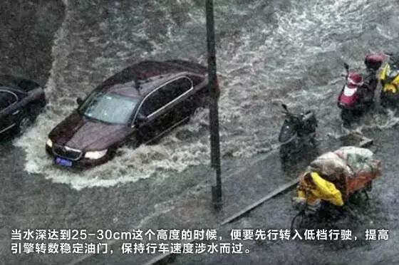 降水很容易造成路面积水,有时候甚至颇深,这让很多车主头痛。其实水深15厘米左右,不会对汽车有任何影响,完全可以用正常的车速行驶,车辆不需要担心水进入车内或者车辆抛锚。水深的另一个临界点大约是半个车轮的高度,也就是25厘米至30厘米之间。当水深达到这个高度的时候,便要先行转入低挡行驶,提高引擎转数,稳定油门,保持行车速度涉水而过。