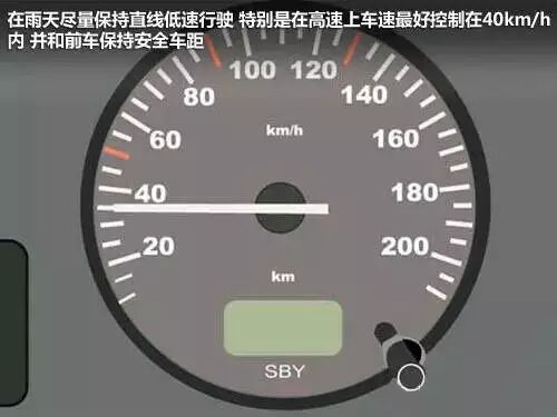 在雨天尽量保持直线低速行驶,特别是在高速上,车速最好控制在40km/h内,并和前车保持安全车距,勿跟大货车。更需要注意路边的行人,应减速慢行多鸣笛,耐心避让,切不可与行人或非机动车抢道。勿随意变道,勿猛打方向盘,转弯时应缓踩刹车,注意打灯提醒行人。如果需要停车,尽量提前100米左右减速、缓踩刹车。