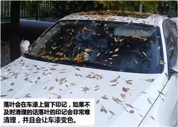 深秋时节,落叶纷飞,一夜间车上落满树叶的现象很常见。很多朋友对此不以为然,认为等开车的时候落叶也就吹落下去了。殊不知落叶在离开树枝后会变质腐烂,落叶本会掉色,并且产生一些粘性液体,并且早晚温差加大会导致落叶上会有露水,潮湿会加快腐蚀速度,若不及时清除会对漆面造成损伤。