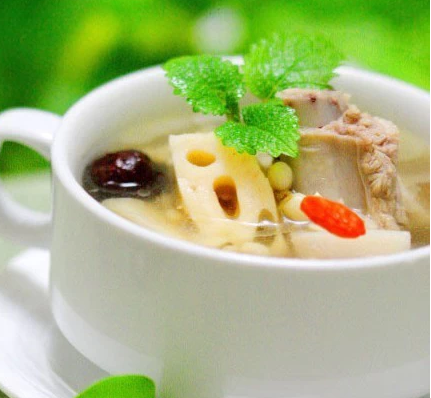 莲藕排骨汤的起到清热消痰、补血养颜的作用,若有贫血、心慌失眠的人吃了可以调节这些病。因为中和莲藕的热性,如果是是体质虚寒的女士最好是用莲藕来煲绿豆会比较好的。