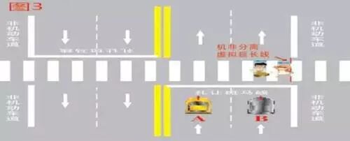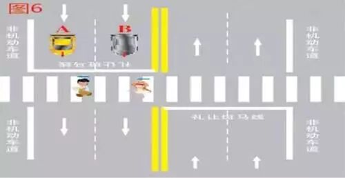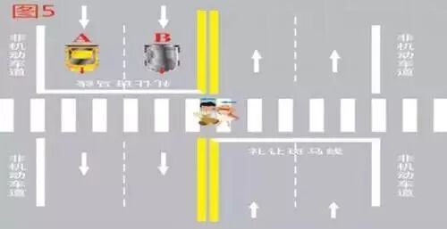 3、行人越过机动车道、非机动车道分隔线,进入上述位置,机动车A、B未停车让行的,属于违法行为,应当处罚。