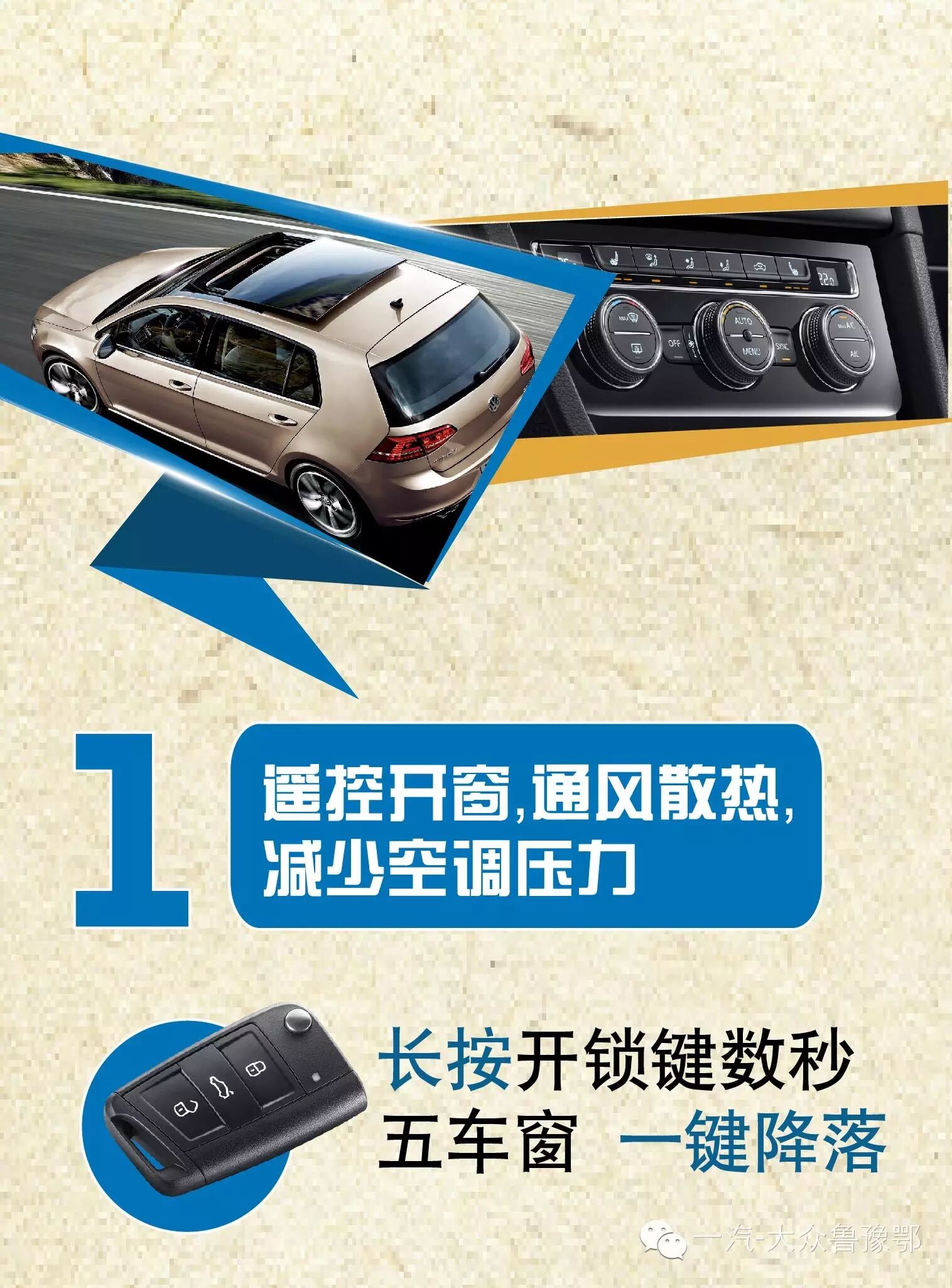 上车之前,快速的打开窗户让车内沉闷的空气稍加流通,虽说不是跟空调系统相关,但是却实实在在的影响着空调的效果和使用寿命。一汽-大众的车除个别车型外,均可使用遥控钥匙在很远处就打开所有窗户,是不是非常贴心?