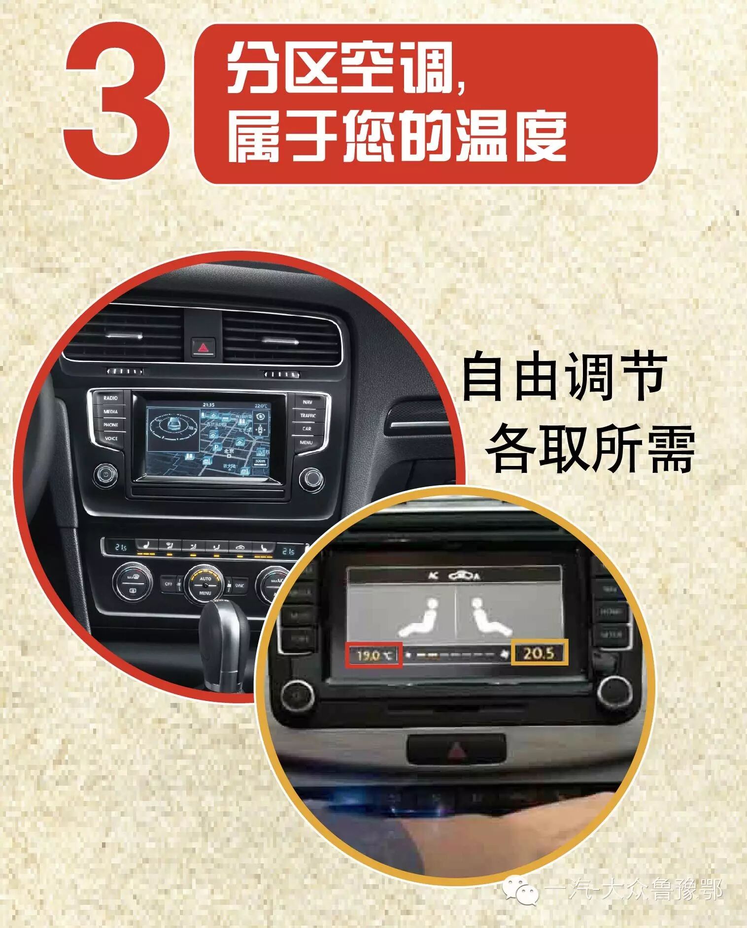 大众车最尊重人的用车享受,同样也最尊重个性化的需求。双区空调的设计,可以让两侧的人根据自身的需求定制温度,和谐社会,从点滴做起。
