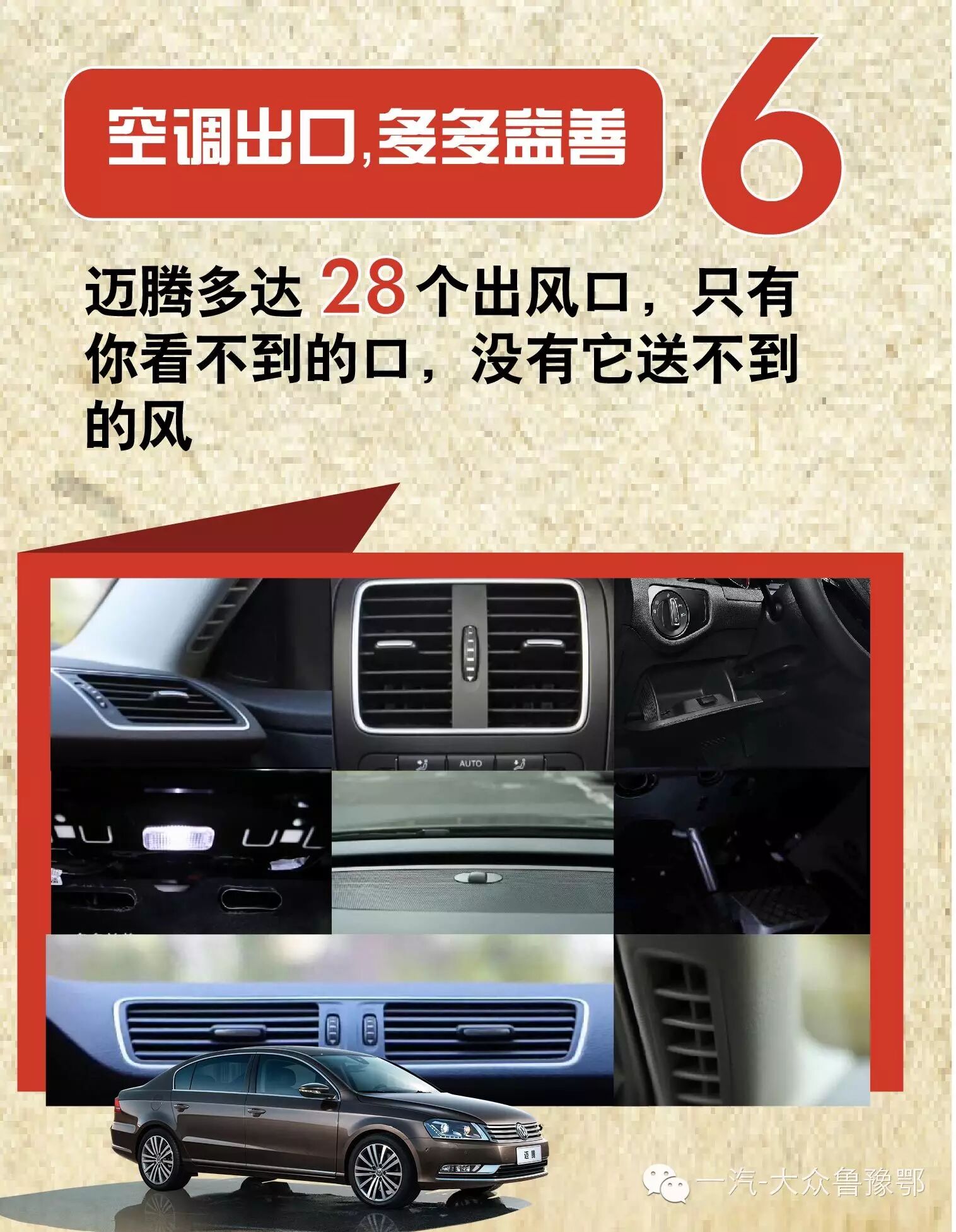 以迈腾为例,一汽-大众无微不至的放置了28个出风口,除了那些明处的,在驾驶员及副驾驶腿部有着九个,中控台顶部有六个,就连手套箱里都藏着一个出风口,全方位无死角为您送来舒适柔风,那些没有后排中央出风口的车型,在前排座椅的下面,藏着通往后排的出风口,当把风向开关拨到向下的位置,后排就可以享受舒适的风了。