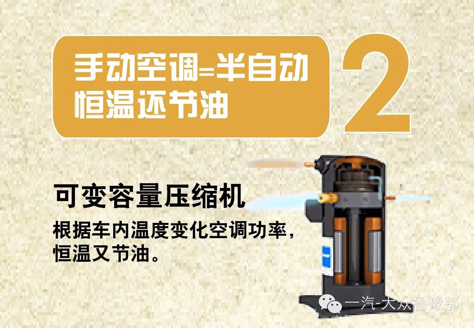 大众车系的手动空调使用的是可变容量压缩机,可以根据车内温度变化空调功率,实则为半自动空调,既恒温又节油。