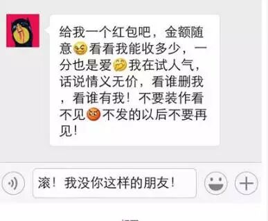 微信朋友圈类型人格之一,常常出现于节假日前夕,求人发红包要钱过节,要钱买冰棍,要钱买长腿袜...几毛几块钱的事,恬不知耻,都这么大的人了!