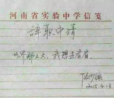 2015年4月14日早晨,一封辞职信引发热评,辞职的理由仅有10个字:“世界那么大,我想去看看”。网友评这是“史上最具情怀的辞职信,没有之一”。被各大媒体报道后,事件的女主角也火了,最后在成都开了客栈...