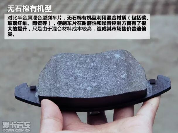 无石棉有机型刹车片又称NAO型刹车片,其组成材料已经历了几次变革,大约运用包含十七种不同的混合物材料(玻璃纤维、碳、陶瓷等)以保证制动性能,并且在耐磨性和噪音等方面得到了很大的提升。只是由于混合物材料成本问题,导致无石棉有机型刹车片售价较高。