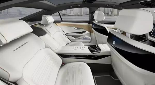 概念车采用四座布局,内饰采用灰白双色调搭配的设计,并由棕色装饰,这块可能是实木材质,整体风格科技感很强。另外,除了中控台上有一块大尺寸的触摸显示屏外,新车仪表盘同样配备较大的液晶屏幕,换挡杆的造型也和新款奥迪Q7类似,采用了几何形的设计,未来感十分浓厚。