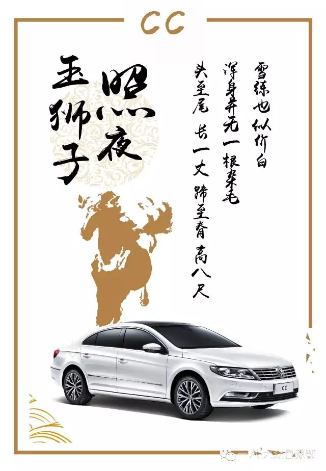 入选理由:作为大众车的颜值担当,以名驹“照夜玉狮子”比喻一汽-大众CC,确有其贴切处。先说外形,CC轿跑车车身设计,流线型设计,无框车门,静蕴风雅,动则绽放光华,将轿车的优雅,与跑车化线条动感相融,二者如出一辙的雄美优雅,皆能让人过目不忘;再说品行,尽忠事主绝无二致,CC外翻式全景天窗,内饰颜色优雅组合,Nappa真皮座椅,给车主舒享致雅空间。