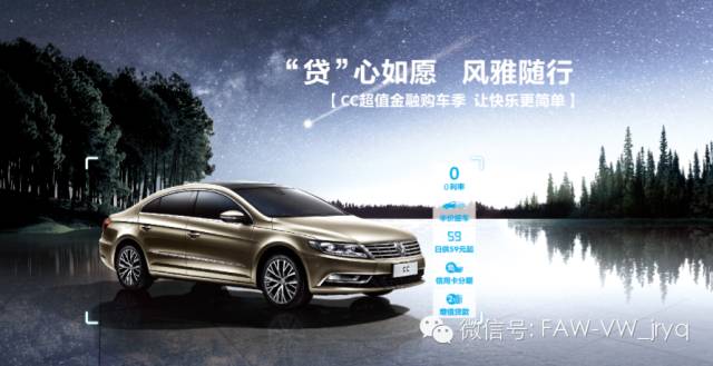 为感谢消费者的支持与厚爱,一汽-大众超值金融购车季推出了更动人的优惠政策,首付30%起,享12-36期0利率/超低利率;0月供半价提车;首付50%,日供59元起;信用卡双免。让车主们在感受CC设计、科技、创新之美的同时,更尊享由它带来的极具品位的优雅生活。