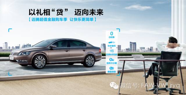 此次,一汽-大众以礼相“贷”,让广大用户更加从容的迈向未来。首付30%起,享12-36期0利率/超低利率;0月供半价提车;首付50%,日供49元起;信用卡双免。让车主牢握用款主动权。还有更多购车方案随心选,财富人生,投资理财不耽误。