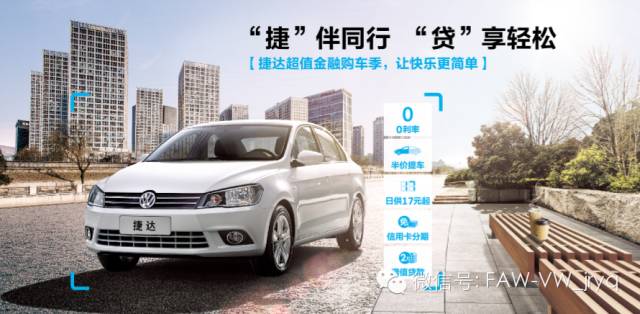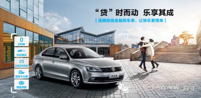 而一汽-大众超值购车季,则为幸福来加速。首付30%起,享12-36期低利率;低月供半价提车;首付50%,享低日供;信用卡分期享超低优惠费率。 让车主即享趣动时刻。