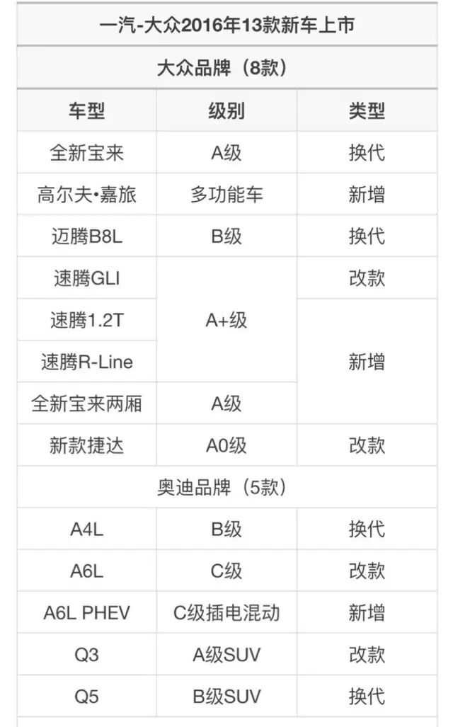 2016年,是一汽大众的产品大年。SUV、MPV已经到达张家口,还有13款新车即将登场,硬通货是迈腾B8L、全新宝来、高尔夫嘉旅。