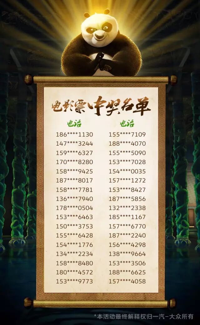 2、将作品分享至朋友圈,邀请好友点赞,每天点赞排行前50名的网友,每人将获得一汽-大众全新宝来送出的《功夫熊猫3》电影券家庭套票2张。