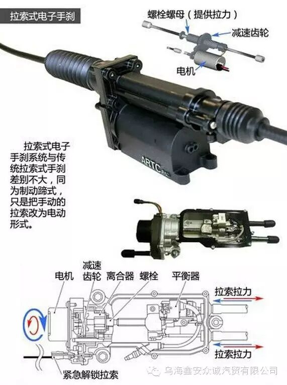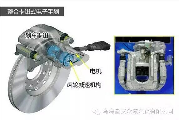 言归正传,一起来看看电子手刹是怎么工作的。有一些电子手刹是通过一个开关控制一个电机带动卷线器,带动拉线,来锁紧车轮,与传统的机械手刹差异不大,可以理解为把手柄换成了个按钮,并且对车轮是卡钳驻车还是鼓式驻车并不受影响,还容易布置,但是功能却过于单一,沦为非主流。