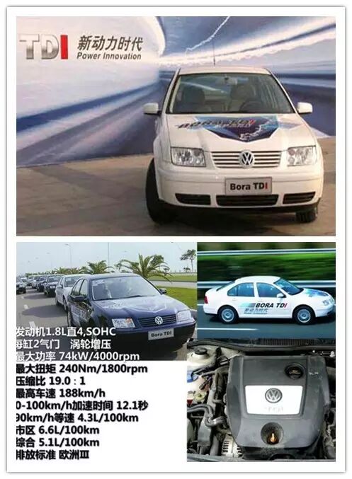 2004年2月 宝来1.9TDI柴油版上市。这里不得不提,宝来是国内第一辆柴油家轿,这可能与柴油版轿车在国外的盛行有关,所以一汽-大众成为柴油车的先驱。“这一款柴油版的宝来运用了众多新技术,其中泵喷射系统、可调叶片式涡轮增压器都是首次在国产轿车上应用。低速扭矩输出达到240Nm,在低速加速与持续爬坡方面的能力趋于完美,而油耗却仅为每百公里5.5L,曾经创造过一箱油跑1000公里的记录!这款车上可变泵喷嘴增压器及废气再循环等尖端技术的运用,让宝来TDi在动力、节油、环保、安全等方面都更为出色,开创了国产汽车的新动力时代。”(引用于网上车市。)