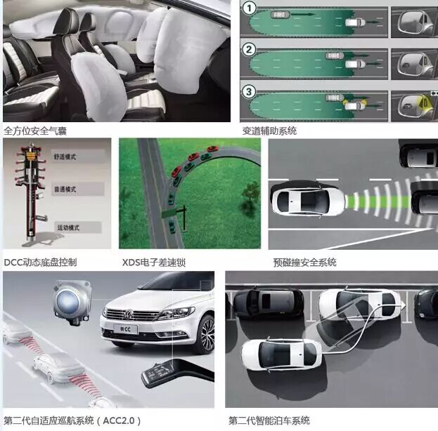在主动安全方面,CC拥有最高版本的ESP车身电子稳定系统、第二代ACC自适应巡航系统带碰撞预防功能、Lane Assist车道保持系统、Side Assist变道辅助系统、XDS动态电子差速锁、MDF动态灯光辅助系统、全系标配胎压监测及全方位安全气囊。