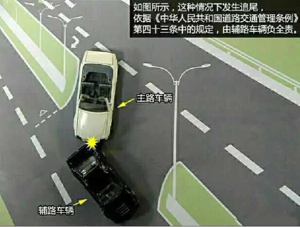 主干道行驶的车辆在进入辅路时,在出口追尾辅路行驶的车辆,这种情况下,根据《中华人民共和国道路交通管理条例》第四十三条中“支路车让干路车先行”的规定,追尾事故是需要前车负全责的。