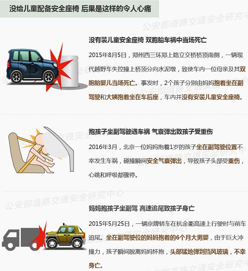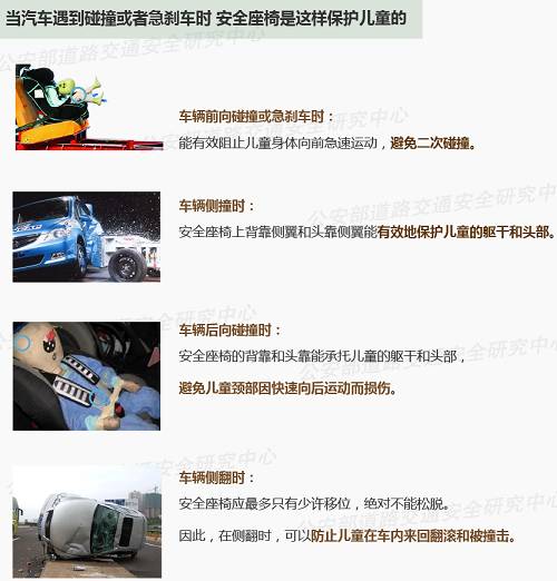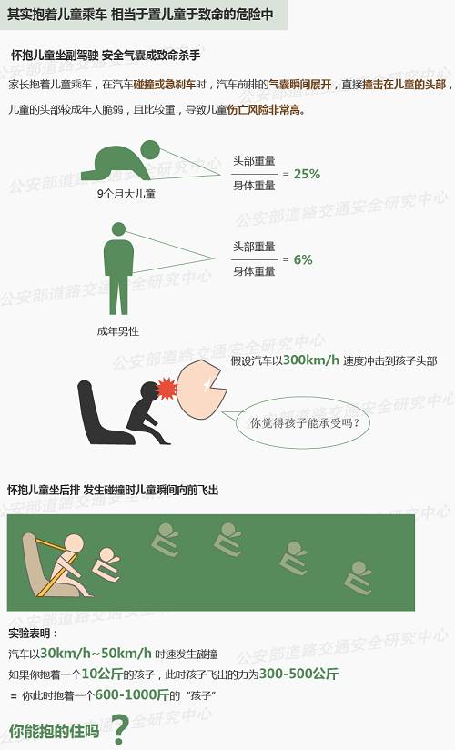 如果大人抱着孩子乘车时以时速50公里/时发生撞击,大人手中的婴儿重量会加重约30倍,10公斤的小朋友就将产生高达300公斤的前冲力,即便强壮的男士仅用双手也是难以保住孩子的安全的。当然此时家长也会突然向前,对孩子脆弱的头颈造成巨大的伤害。