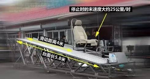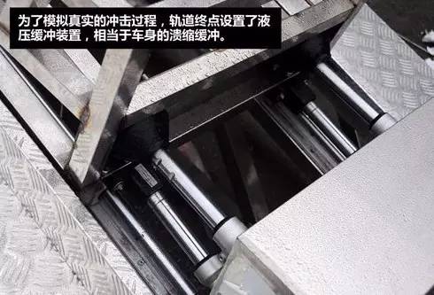 这个架子是一个模拟汽车冲撞的试验台,台面与地面夹角为15度,配有安全带的汽车座椅安装在轨道上,撞击点的末速度大约25公里/时。这个重冲撞的效果其实与碰撞还差的很远,只相当于一脚急刹车的效果。