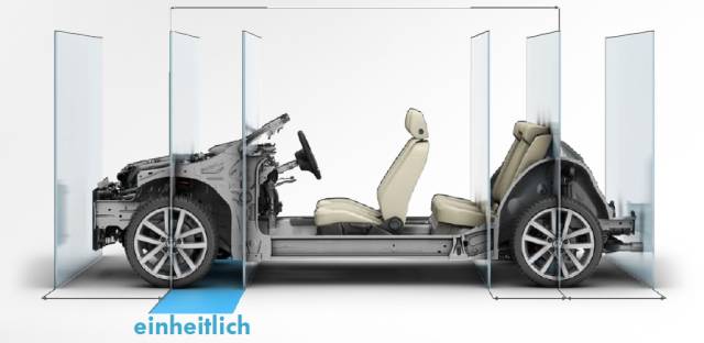 MQB平台由7个部分构成, 每个部分都有不同变种,通过排列组合,满足不同车型的要求,可以生产涵盖A0级到B级的众多车型,取代了目前PQ25、PQ35和PQ46大大小小三个旧平台。