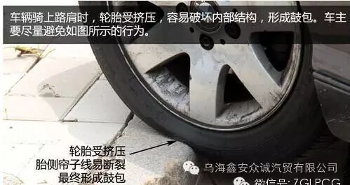 其实引起鼓包最多的还是上马路牙子,这个过程中轮胎严重变形。车速越高、与马路牙子的角度越小,变形就更严重。一辆车如果以40公里的时速,40到70度的上坡角度,斜着开上15厘米高的马路牙子,轮胎的帘布层几乎100%会受损。 另外,如果车子较高速经过一些凹凸路面时,比如凹坑或者井盖等,轮胎也会因为受到瞬时的强大冲击而使帘布层发生断裂。还有,如果车子长时间停在不平的路面上,轮胎帘布层长时间处于扭曲状态,这对于轮胎抗冲击的性能也是不利的。而这些,都是轮胎受外力造成的,而非轮胎本身的问题,再坚固的轮胎,也经不起这样折腾。