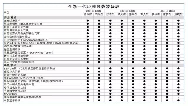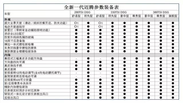全新迈腾的内饰配置同样领先市场同级,除舒适型外,其它车型均标配集控式三幅真皮多功能方向盘、前排座椅12向电动调节、副驾驶座椅后排电动可调(俗称老板键)等豪华装备,足见其商务旗舰属性。另外,全新迈腾还标配琴弦式一体化设计前仪表板出风口、仪表板适时同步计时石英钟等,带来全新的视觉和感官享受。