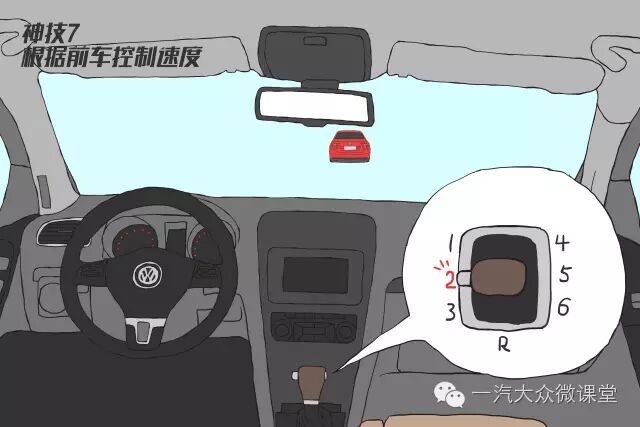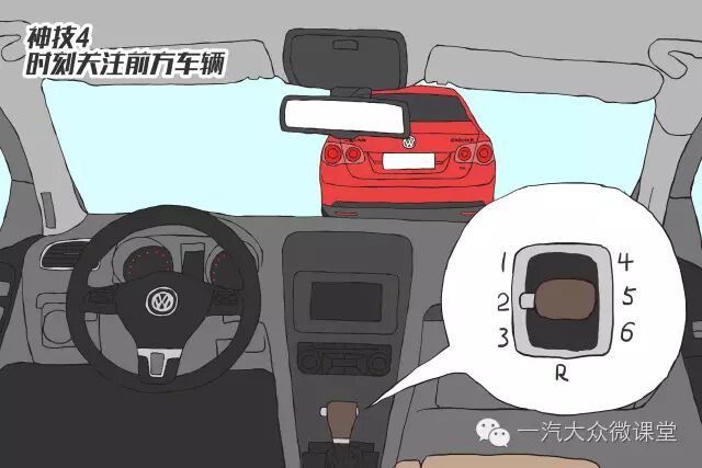 跟上前车后,如果最前面的车还在动,你可以稍踩油门稳稳跟进,一旦发现最前面的车加速了,就切入二档。反之,最前面的几辆车已经亮了刹车灯,就立即挂到空挡松开离合向前滑行。