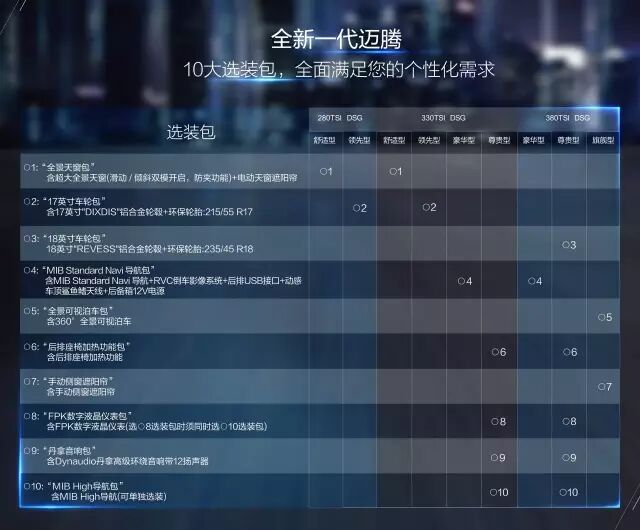 虽然让钟情于迈腾的粉儿们久等了,但好饭不怕晚,全新一代迈腾着实让大家充满惊喜,除了以上的配置之外,还有10种选装包,让你的搭配随心所欲。比如,舒适型一样可以选装超大全景天窗;花5000元在尊贵型上加装数字液晶仪表和MIB High导航,又或者你还可以再来一个后排座椅加热,拉近与旗舰型的距离。全新一代迈腾是不是为你考虑周到?
