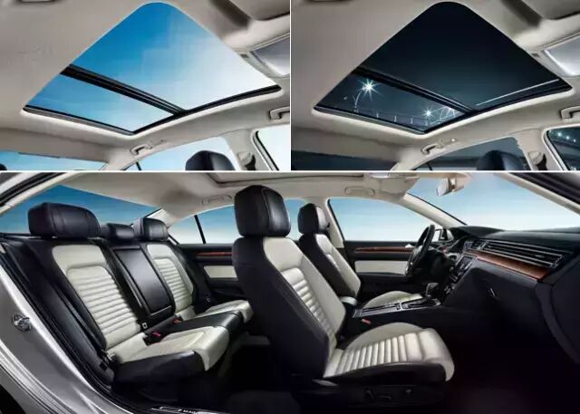 当然,相比于欧版PassatB8,全新一代迈腾还有多项中国专属装备,首当其冲的便是超大全景天窗,其中前排玻璃可整体打开,提供更大的可视面积与开启尺寸,给了你一个欣赏风景的绝佳角度;夜晚,在你欣赏银河星空的同时,中国专属的全景天窗两侧氛围灯为你增加了浪漫的色彩。