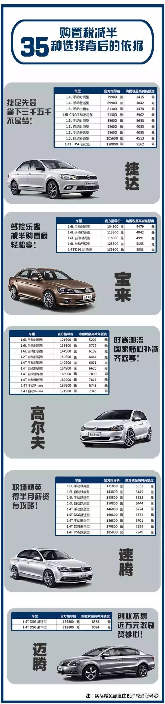 目前一汽-大众品牌排量1.6升及以下的车型占所有车型80%。捷达、宝来、高尔夫、速腾(GLI除外)、迈腾车型,均可享受购置税减半。