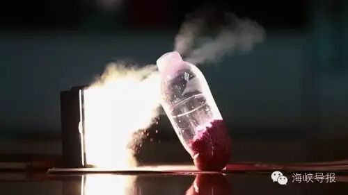 塑料瓶突然被炸得飞起,瓶盖被冲开,干燥剂粉末喷出