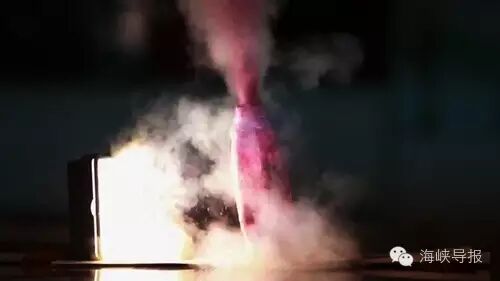 约一分钟后,塑料瓶不断冒白烟,瓶底被烫得变形,瓶子歪向一边