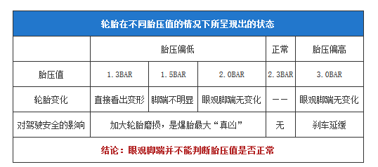 原来胎压过高或者过低都会引发这么多问题,宝宝表示好!害!怕!那么,机智如宝宝,想到了蹲下来用眼睛看看,或者用脚来揣一下轮胎,这样提前检查一下是不是就万事大吉了呢?下面小编给大家看一组数据: