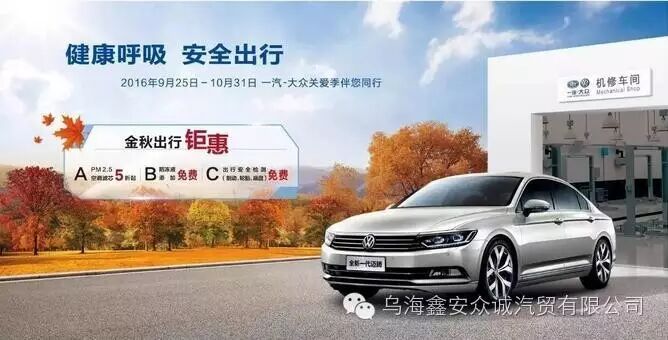 秋高气爽,层林尽染,金秋是您自驾出游的好时节,您是否正欲发动引擎,去探寻秋色之美呢。针对长假出行用车需求, 9月25日-10月31日乌海鑫安众诚一汽-大众为您推出秋季关爱活动!