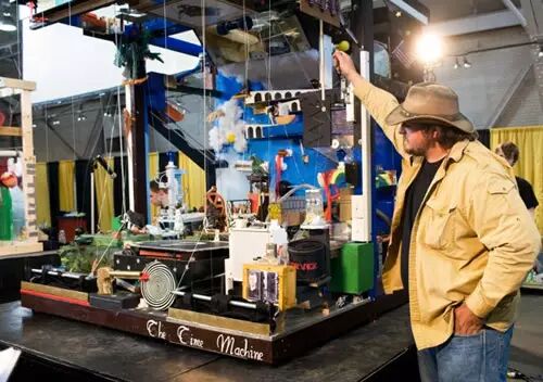 这是一种 “把简单的事情变复杂”的机械,利用连锁反应引发机关,很像多米诺骨牌。多米诺骨牌的原理是推倒第一张牌,所有的牌就会一个接一个都倒下,戈德堡挑战和它类似而又更加复杂。你可以把戈德堡挑战看成是多米诺骨牌被换成了木棍、皮球或者其他八竿子打不着的东西,利用机械原理连到一起。最早它是鲁布·戈德堡的漫画,经过后人的不断演绎,世界上出现了很多让人眼花缭乱的设计。这个机械是把不相关的事物连在一起,看起来简单,实际上非常需要设计者的认真和耐心,以保证每一个步骤都精确无误,最后才能让机械达到预期的效果。