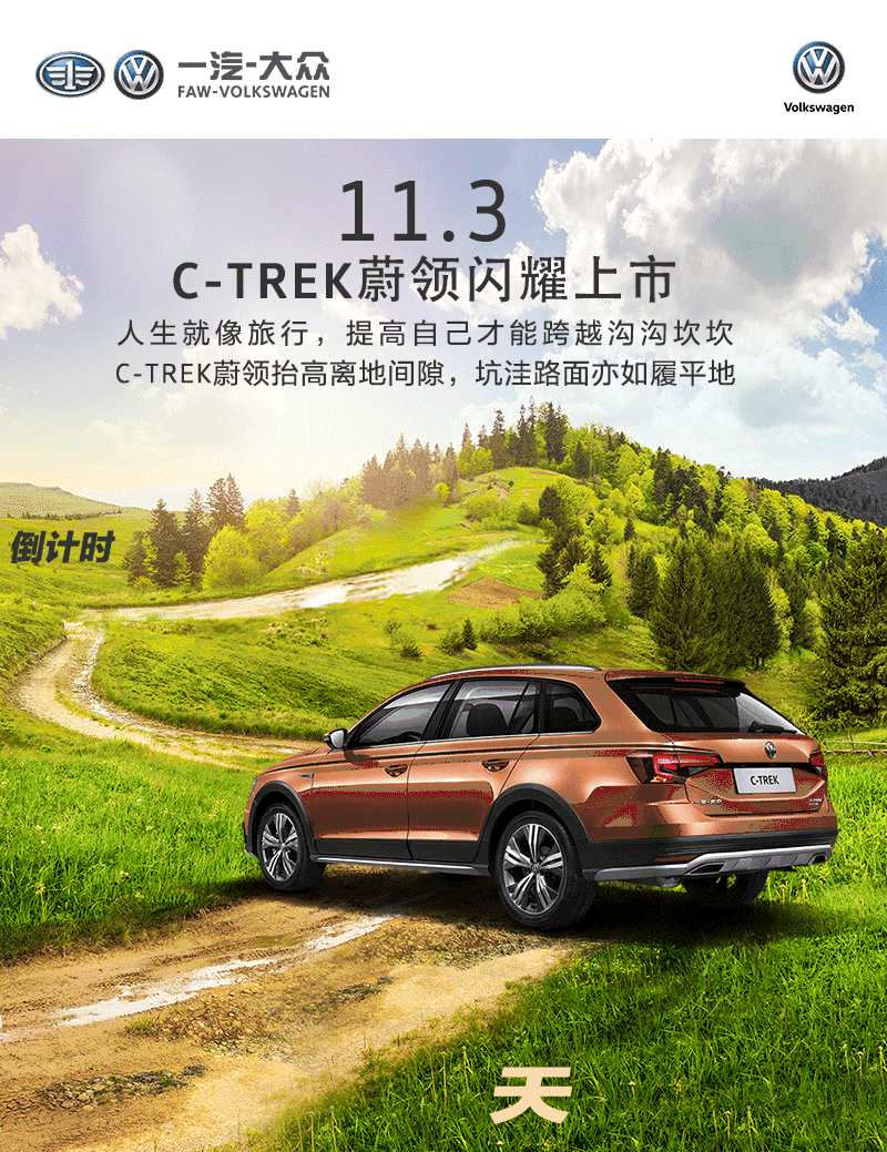 一汽-大众首款跨界旅行车C-TREK蔚领,作为第七个儿子,拥有优美流畅的车顶线条,尽显运动活力的环绕式腰线。周身洋溢的动感气息,焕发着无可抗拒的非凡魅力,让认真生活的你,享受更好的驾乘体验。