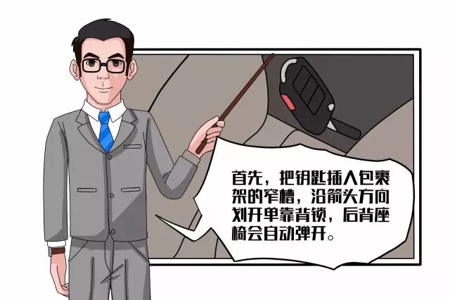 遇险时不要惊慌,前座驾乘人员要迅速移到后座,把钥匙插入包裹架的窄槽,沿箭头方向划开单靠背锁,后背座椅便会自动弹开。