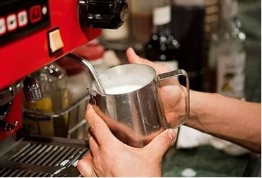 一项锦上添花的工作就是制作奶泡。放掉蒸汽管里残存的水,然后把蒸汽喷嘴放入牛奶液面下并开启开关,慢慢地移动喷嘴,在喷嘴露出表面时停止,重复几次漂亮的奶泡就诞生了。
