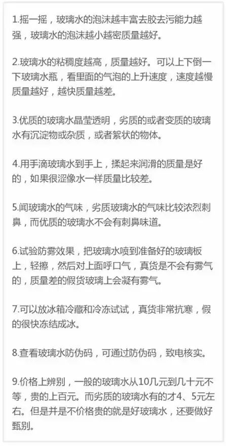 除了没必要自己制作玻璃水,还要学会很好的辨别玻璃水的真假好坏,好的玻璃水具有去污、驱水、防冻、抗静电、防腐蚀等功能。可以有效去除灰尘、润滑油、汽柴油、残余上光蜡、树胶、鸟粪、高速公路上的虫胶等。劣质的玻璃水由于其所含的酒精成分过高,会对汽车漆面产生不良影响,损害汽车漆面的光泽度、硬度,并且会对所接触的橡胶件和塑料件产生胀溶作用,降低这些配件的硬度,以及产生颜色差异。