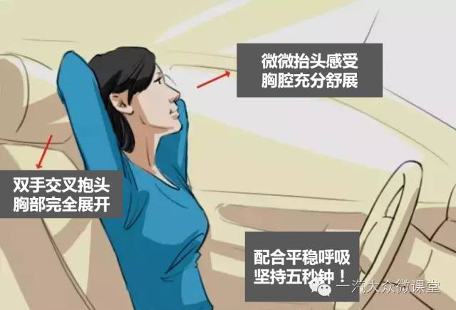 坐在座椅中间位置,将双手交叉抱头,肘关节尽量向后打开,胸部舒展,脸向上仰,呈45度直到胸廓有被拉开的感觉,深呼吸5次,有没有觉得肩部和背部特别的舒爽!