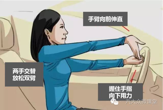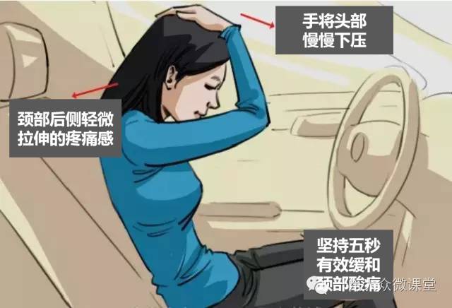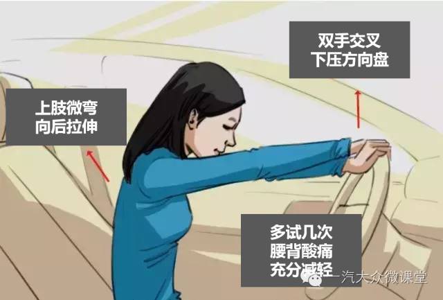首先将左、右手伸直抓到方向盘上,且双手交叉,然后身体如弓状后下方用力拉伸5秒钟,并保持均匀的呼吸,要注意掌握拉伸力度。小伙伴们有没有觉得腰背部酸痛在减轻?