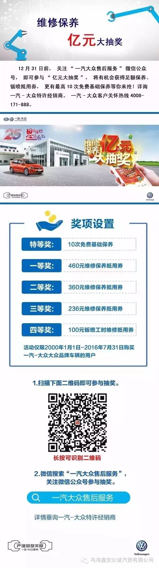一汽-大众成立25周年之际,为实现更好的客户服务体验,打造更优质的客户服务品质,从而不断提升一汽-大众客户满意度,推出 “25周年感恩钜惠,亿元礼包大抽奖”微信大抽奖活动。